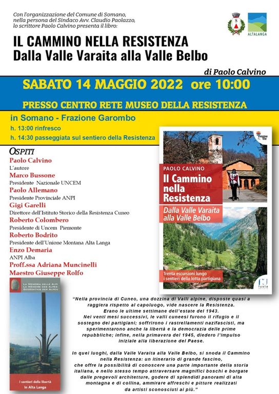 A raccontare questo percorso, ecco il libro di Paolo Calvino, professore e studioso, amante della Storia, che sabato 14 maggio sarà protagonista, dalle ore 10.00, presso il Centro Rete Museo della Resistenza a Somano, in frazione Garombo: con l’organizzazione del Comune di Somano e del sindaco, Claudio Paolazzo, l’autore dialogherà con Marco Bussone e Roberto Colombero (rispettivamente presidente nazionale e presidente regionale per il Piemonte dell’UNCEM, l’Unione Nazionale di Comuni, comunità ed Enti Montani), Paolo Allemano ed Enzo Demaria (presidente provinciale e della sezione di Alba dell’ANPI, l’Associazione Nazionale Partigiani d’Italia), Gigi Garelli (direttore dell’Istituto Storico della Resistenza di Cuneo), Roberto Bodrito (presidente dell’Unione Montana Alta Langa), la professoressa Adriana Muncinelli e il maestro Giuseppe Rolfo.