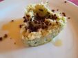 Deliziosa la quenelle di patate e olio con pesto, fagiolini e pinoli tostati.