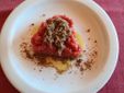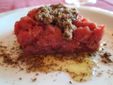 A seguire tartare di manzo con salsa tapenade (fatta con olive, capperi e acciughe) su polvere di cappero essiccato.