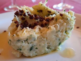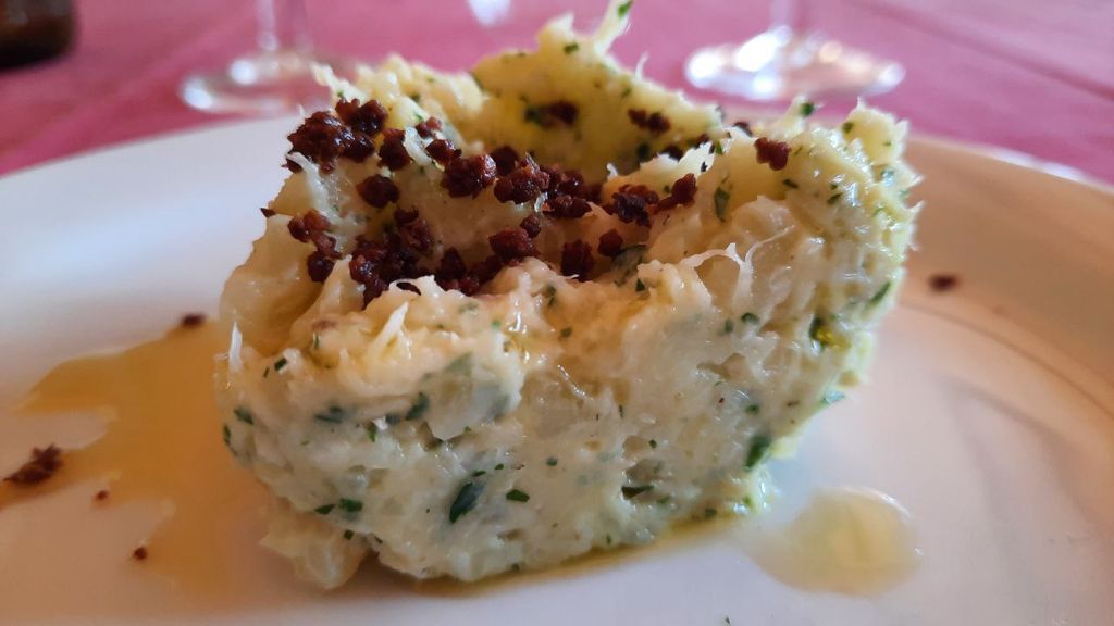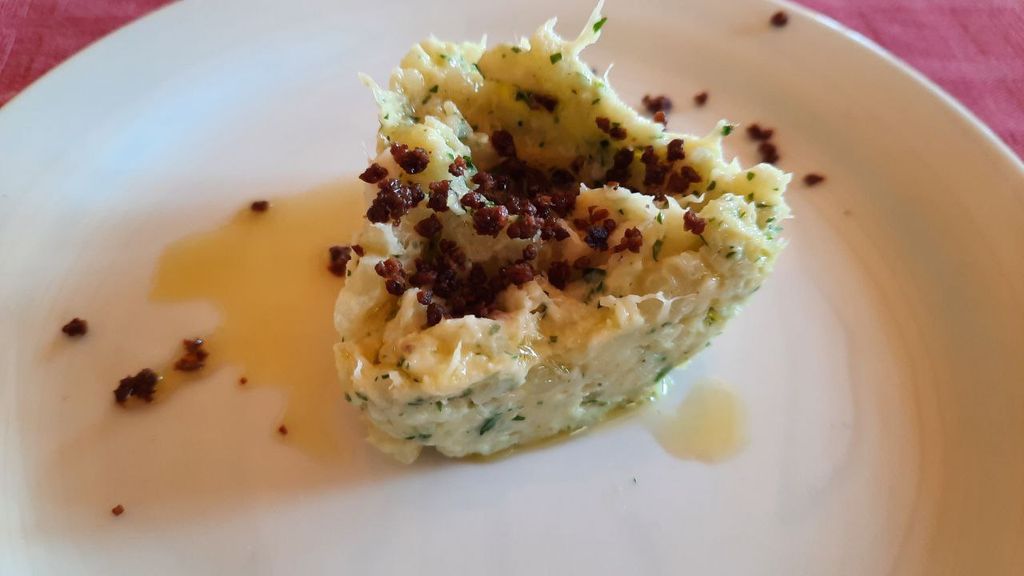 Delicato il brandacujun con baccalà e buccia di limone con polvere di olive taggiasche.