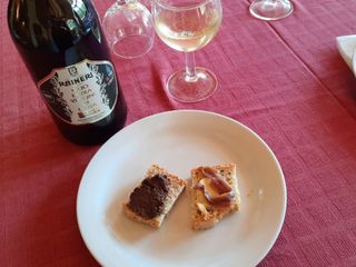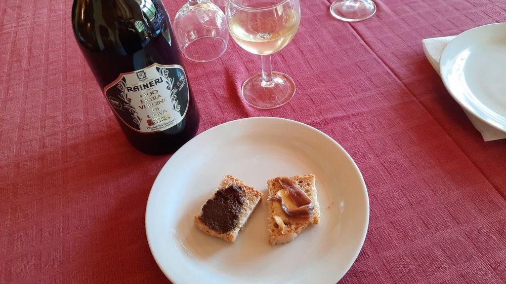 Via con i crostini fatti con pane di Triora in versione paté di olive e acciuga. Immancabile un filo d'olio.