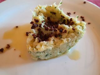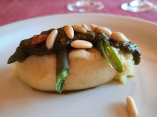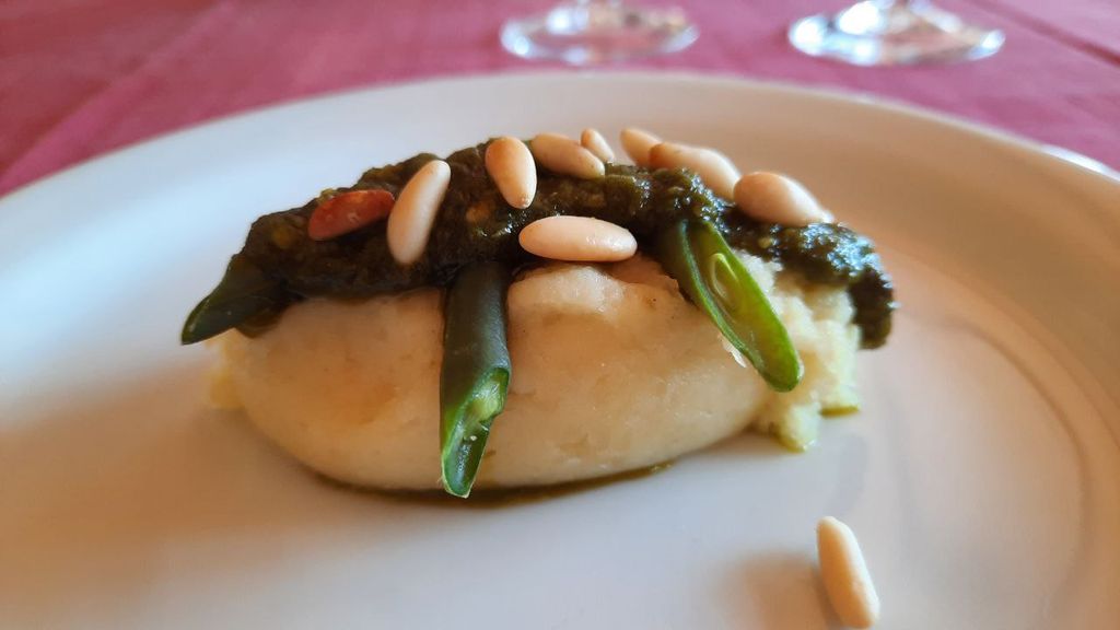 Deliziosa la quenelle di patate e olio con pesto, fagiolini e pinoli tostati.