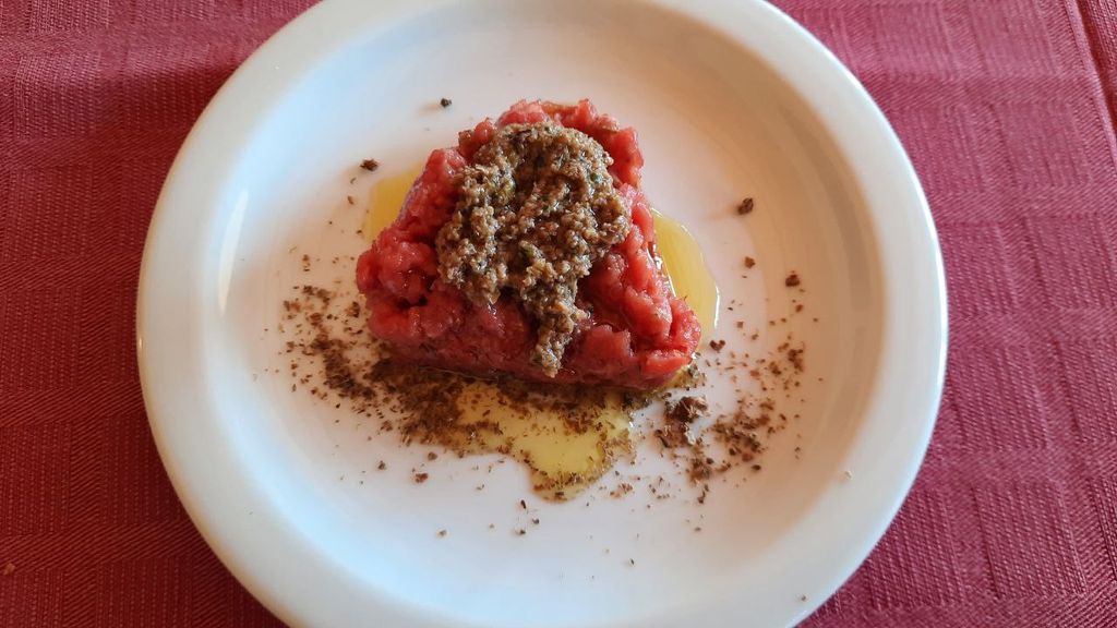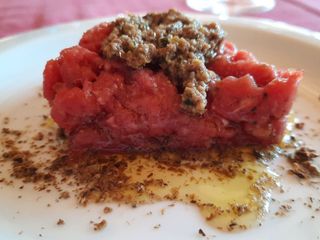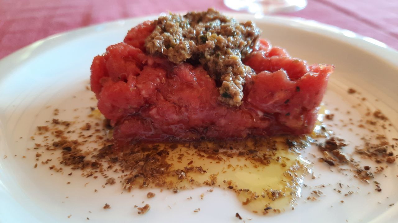 A seguire tartare di manzo con salsa tapenade (fatta con olive, capperi e acciughe) su polvere di cappero essiccato.