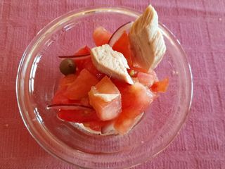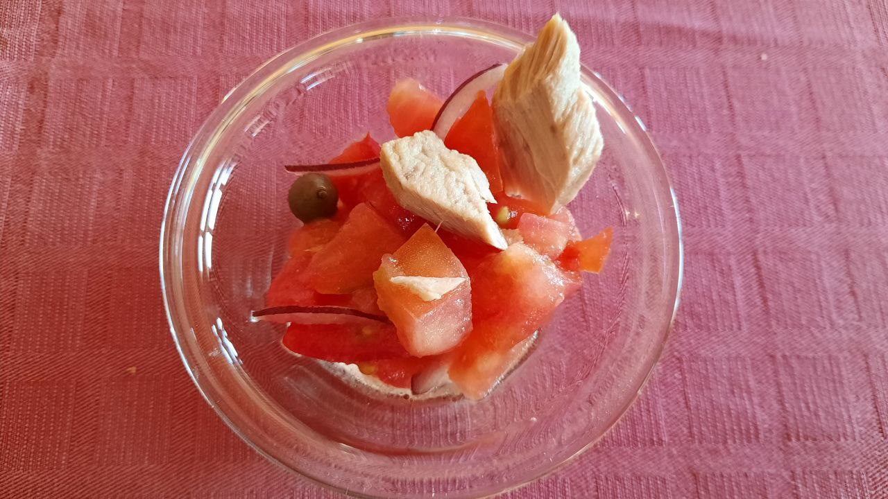 Poi l'insalata ligure con pomodoro cuore di bue, filetti di tonno Raineri all'olio di oliva, olive e cipolla rossa.