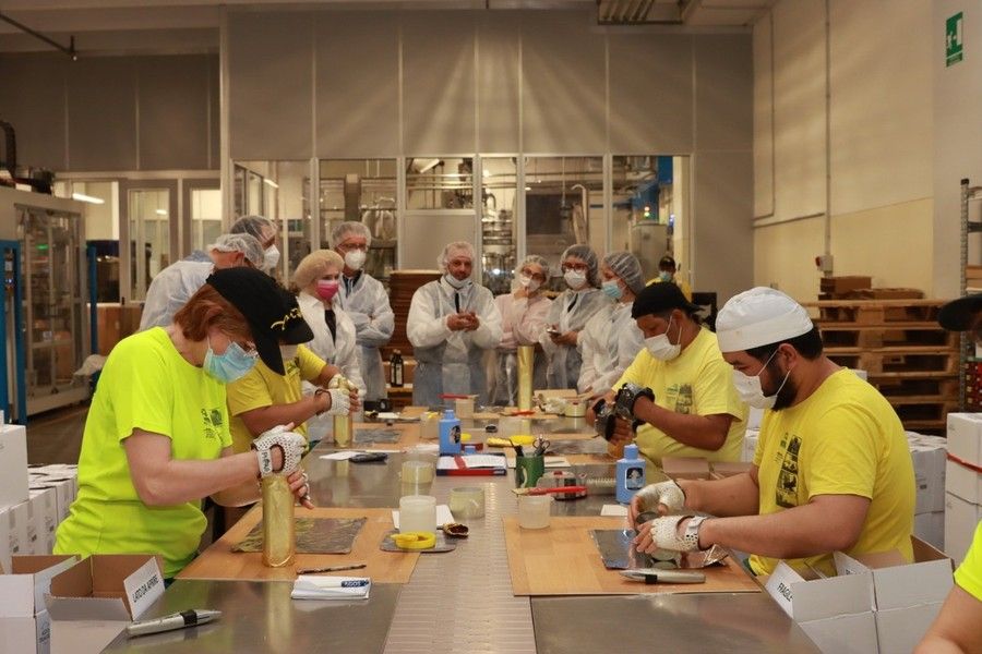 La luce, insieme all'ossigeno e al calore, è uno dei principali nemici dell'olio. Ed è impressionante vedere che le bottiglie vengono fasciate a mano una per una dai dipendenti: non esiste infatti alcun macchinario che possa competere con la manualità dell'uomo.