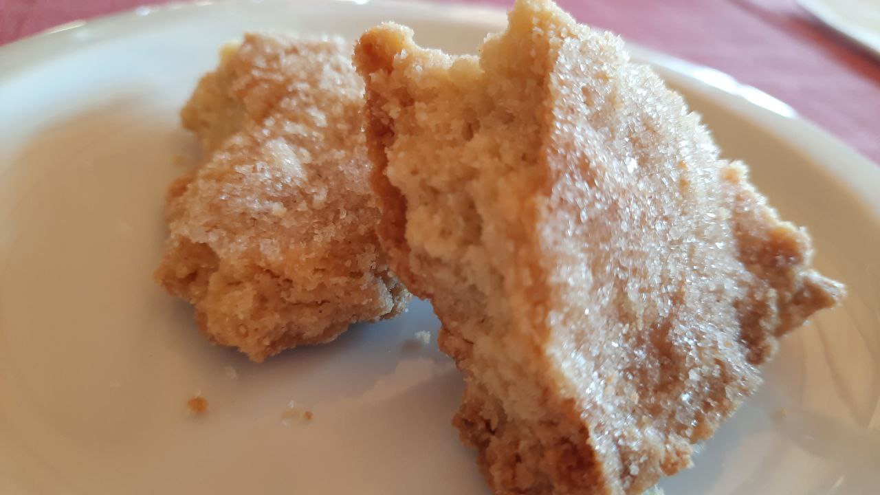 Per chiudere la Stroscia di Pietrabruna, un dolce che si rompe con le mani (si “stroscia” in dialetto ligure) fatto con farina, olio evo, zucchero e vermentino.