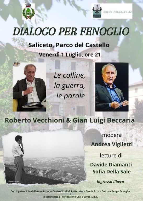Nell’ambito della rassegna estiva Parole e Note in Castello presso il parco del castello dei Del Carretto di Saliceto è in programma una serata letteraria di altissimo profilo. A celebrare la ricorrenza del centenario fenogliano, venerdì 1° luglio alle ore 21, saliranno sul palco i Professori Roberto Vecchioni e Gian Luigi Beccaria, intessendo un "DIALOGO PER FENOGLIO."