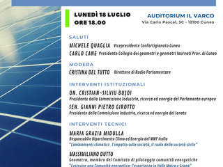 L’evento “Transizione Energetica – Conoscere le Comunità Energetiche” è una tavola rotonda organizzata da Confartigianato Cuneo in collaborazione con Collegio dei Geometri e dei G.L. della Provincia di Cuneo e Radio Parlamentare che vede l’importante Patrocinio della Provincia di Cuneo, Ordine dei Periti Industriali di Cuneo e Fondazione CRC, per condividere le conoscenze e le esperienze sull’argomento delle Comunità Energetiche di forte attualità.
