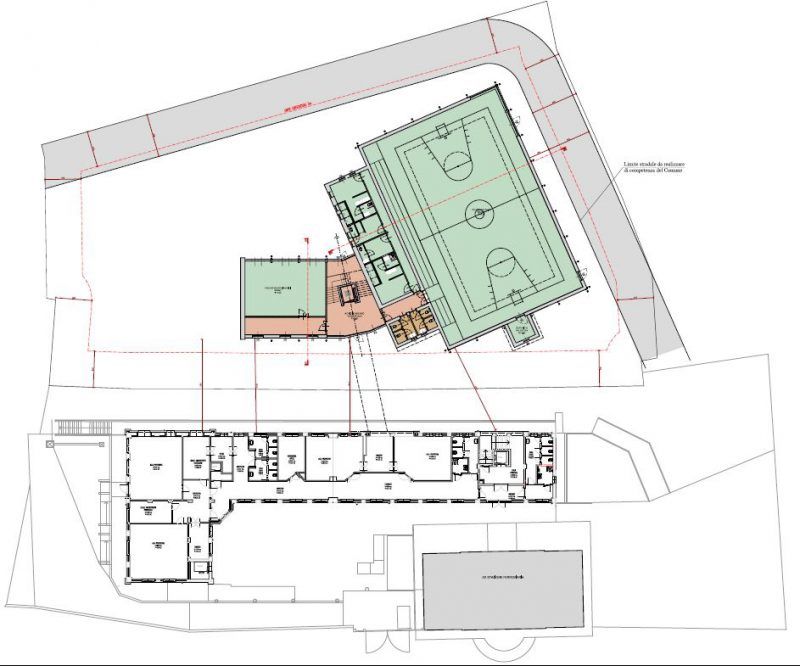 Gli edifici in ampliamento saranno di forma semplice e compatta, in modo tale da risparmiare suolo e garantire un buon coefficiente di forma, indispensabile per raggiungere gli elevati standard di prestazione energetica che ci si è prefissi, oltre a quelli antisismici. L’edificio, che ospiterà i due locali per attività fisica, sarà disposto su due livelli all’interno di una manica con uno snodo all’altezza del vano scala da cui, al piano primo, si imposta una passerella vetrata con struttura in acciaio che andrà a collegarsi con l’attuale edificio scolastico. Sul lato a sud, oltre ai servizi e spogliatoi, verrà realizzata la nuova palestra di tipo B2, dotata di campo regolamentare da basket. E’ previsto anche un locale per attività fisica dei diversamente abili, mentre al primo piano ci sarà una sala per attività aerobica.
