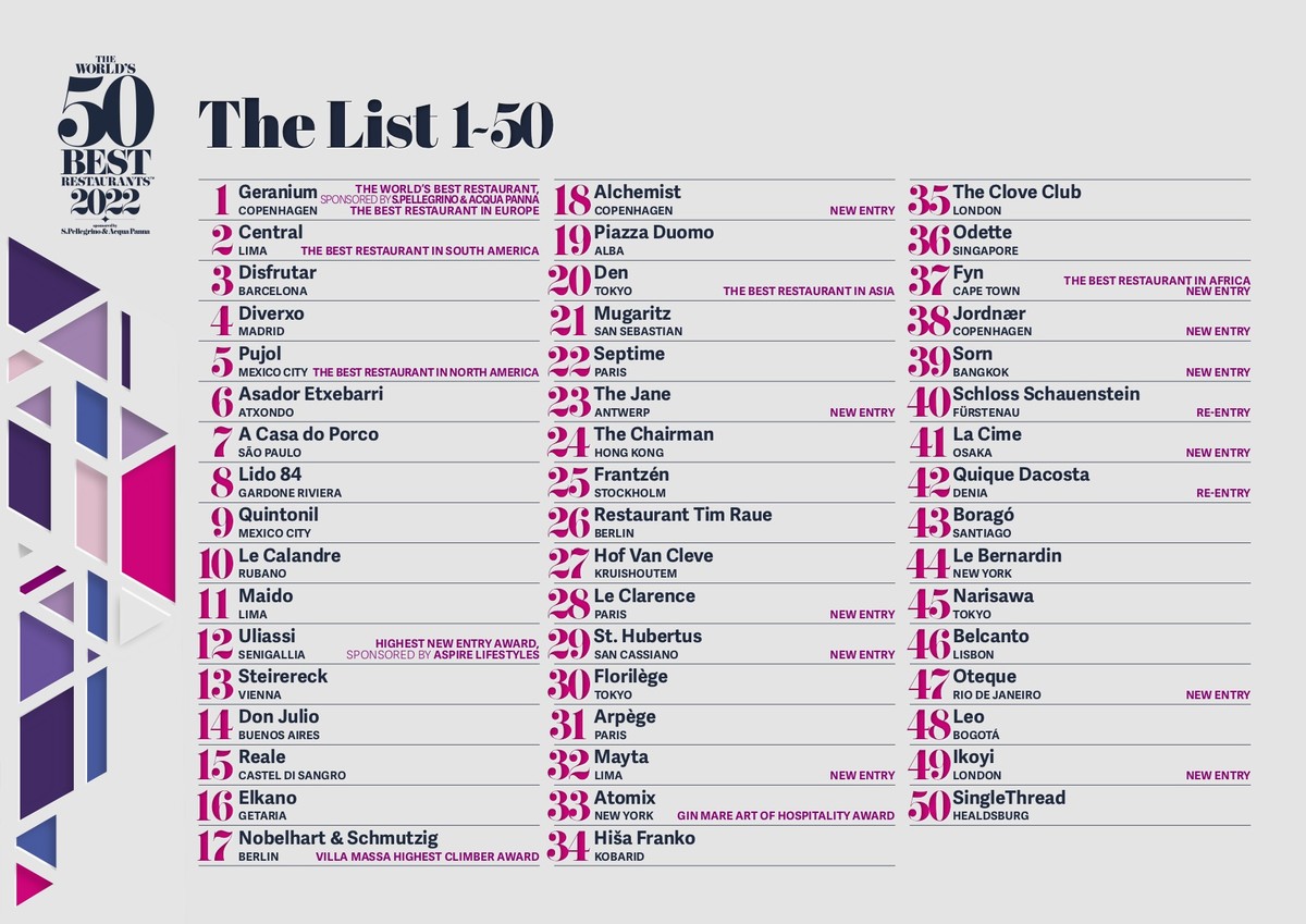 Insieme alla proclamazione del Geranium, proclamato in diretta durante la cerimonia di ieri sera, lunedì 18 luglio, tenutasi presso lo storico Old Billingsgate di Londra e condotta dal famoso attore ed esperto gourmet Stanley Tucci, è stata anche annunciata la classifica dei 50 migliori ristoranti del mondo 2022, che ha premiato l'eccellenza gastronomica di 24 Paesi presenti in cinque continenti, con 12 ristoranti al loro debutto.
