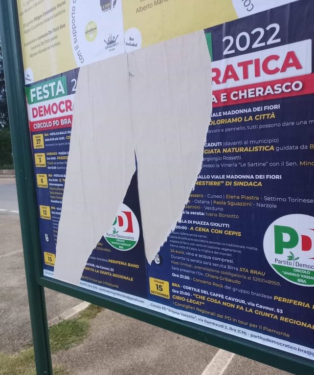 In giro per Bra sono stati ritrovati strappati i manifesti che annunciano la festa democratica 2022, evento organizzato dal circolo Pd ‘Angelo Vassallo’ Bra e Cherasco.