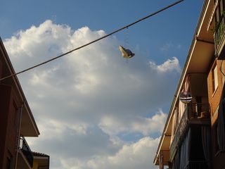 In via Mercantini più di un cittadino si sarà accorto, alzando la testa all’insù, di un paio di calzature legate con i lacci tra loro dondolanti sornione sui cavi delle linee elettriche, esattamente come in via Senator Sartori, dove sono state invece rimosse. Ma che cosa si nasconde dietro questa usanza?