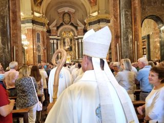 Santuario gremito per il pontificale dell’arcivescovo di Torino, monsignor Roberto Repole, alla presenza del clero locale, tra cui il rettore monsignor Giuseppe Trucco ed i parroci don Gilberto e don Giorgio Garrone.