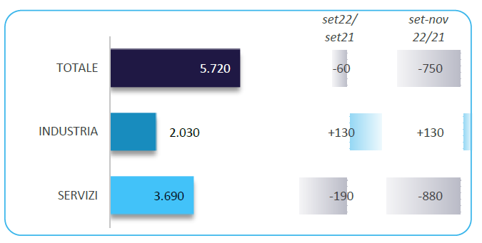 Considerando i dati di settembre 2022 emerge come siano i servizi a formare, ancora una volta, la fetta più consistente della domanda di lavoro con il 64,5% del totale delle entrate (benché siano 190 unità in meno rispetto a settembre 2021 e 880 in meno rispetto al trimestre settembre-novembre 2021). L’industria programma invece 2.030 entrate, generando il 35,5% della domanda totale del periodo, segnando un incremento di 130 entrate sia rispetto all’anno precedente che al trimestre settembre-novembre 2021. Nel dettaglio per ciò che concerne l’industria, 1.680 entrate riguardano il comparto manifatturiero e 350 quello edile.