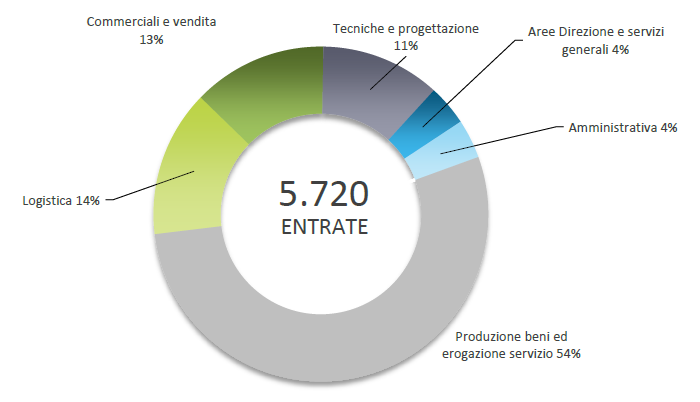 A livello di area di funzionamento il peso maggiore è dato dalla produzione beni ed erogazione di servizio (54%), seguita dall’area commerciale e vendita (13%), dalla logistica (14%), da quella tecnica e di progettazione all’11%, dall’area amministrativa accompagnata da quella direzionale che pesano entrambe per il 4% delle assunzioni previste.