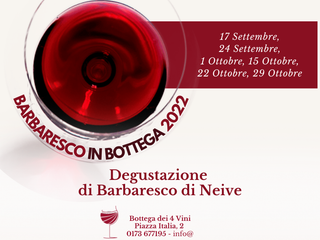 I sabati del 17 settembre, 24 settembre, 1° ottobre, 15 ottobre, 22 ottobre e 29 ottobre: sei date per conoscere in modo semplice, informale e intuitivo il Barbaresco dei produttori di Neive, nella splendida cornice della "Bottega dei 4 Vini", l’enoteca dove Elena e Giorgio accompagneranno gli appassionati in un viaggio alla scoperta delle diverse etichette, tra segreti e caratteristiche che contraddistinguono questo territorio.