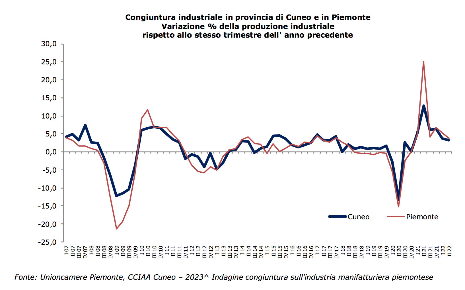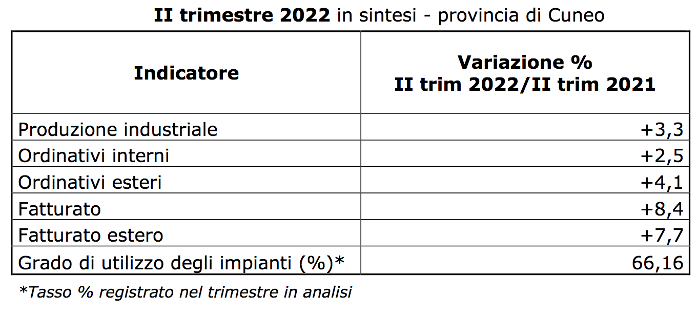 La produzione industriale in provincia di Cuneo nel II trimestre 2022 è salita del 3,3% rispetto all’analogo periodo del 2021, a fronte del +3,8% medio regionale e di incrementi più elevati nelle altre province piemontesi ad eccezione di Novara (+2,2%).