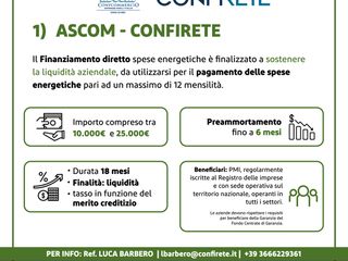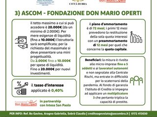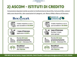- Linee di finanziamento diretto, con tassi agevolati messe a disposizione delle imprese e microimoprese, in collaborazione con ConFidi, istituti bancari del territorio, Fondazione Don Mario Operti, Città di Bra e tutti i Comuni della Zona Ascom Bra, altre associazioni di categoria.