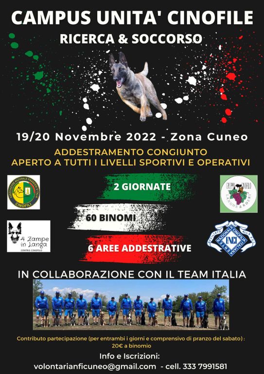 Una buona notizia in previsione del “Campus unità cinofile ricerca e soccorso” che si svolgerà sabato 19 e domenica 20 novembre in diversi siti tra Fossano, Magliano Alpi, Boves, Salmour e Cuneo: il Castello della Nebbia a Salmour, la discoteca “Cesar Palace” di Magliano Alpi, la caserma degli Alpini “Giovanni Cerruti” a Boves, la Polveriera di Salmour, Cascina Gerbo a Fossano. Sarà presente anche il “Team Italia 2022”, la nazionale italiana di ricerche che dura in carica un anno.