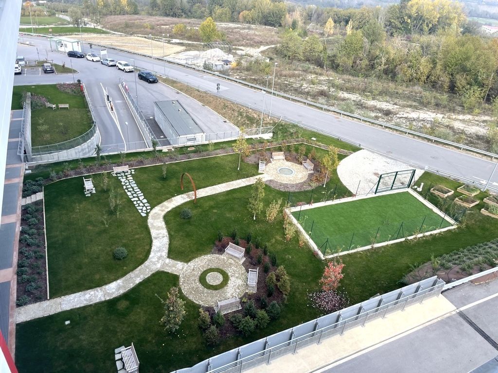 Il progetto del Giardino degli Abbracci e del Commiato prevede la presenza di due distinte aree circolari di sosta. Una simboleggiante la terra (con al centro un “cerchio” fatto di erba e pietra) e una il cielo (con al centro un fontana circolare con acqua ferma che serve a “riflettere” il cielo soprastante). Un arco a metà del percorso simboleggia la “soglia”, mentre poco distante è presente una zona isolata, raggiungibile con un vialetto secondario segnato anche da un accenno di doppio filare, con una panchina che si affaccia sulla valle del Tanaro.