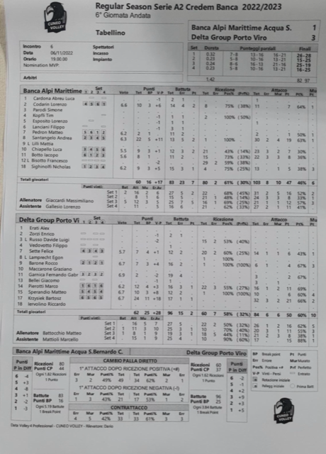 A fare la differenza il rendimento dei martelli di Cuneo rispetto ai pari ruolo veneti (Pierotti e Sperandio 69 e 60%), tutti sotto la sufficienza in attacco: 36% Botto, 30% Chiapello al quale stavolta non è uscita la serata super (ci sta).