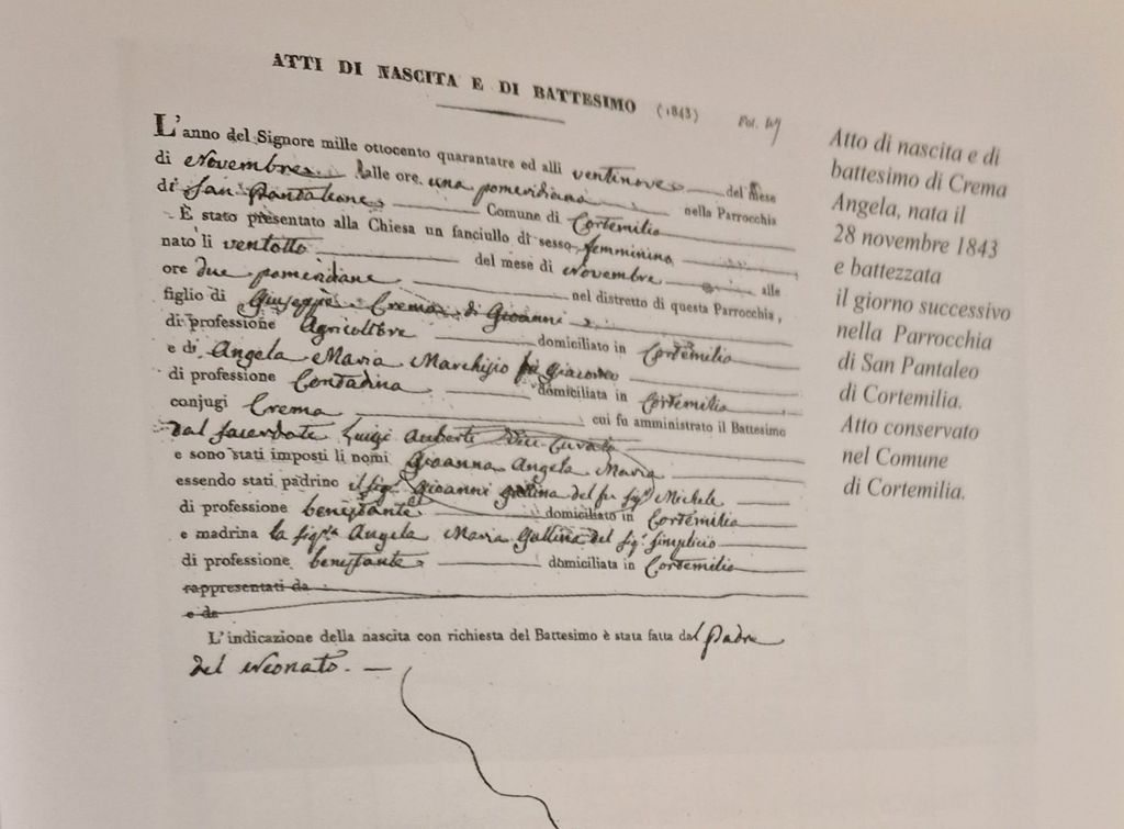 A Cortemilia nasce da una famiglia di mezzadri e viene battezzata nel 1843 la bisnonna del Papa, Angela Crema, mamma di Rosa Margherita Vassallo, la nonna che ebbe un ruolo di primaria importanza nella formazione spirituale del giovane Jorge Mario. Nonna Rosa nasce nel 1884 a San Massimo di Cagna, frazione di Piana Crixia, a poca distanza dal santuario mariano del Todocco. Molto presto viene affidata alla zia materna Rosa, sorella di sua mamma, che vive a Torino. Nel capoluogo piemontese Rosa Vassallo frequenta le scuole, si diploma e più tardi conosce e sposa Giovanni Bergoglio da Portacomaro, suo coetaneo, padre di Mario Bergoglio e nonno di Papa Francesco.