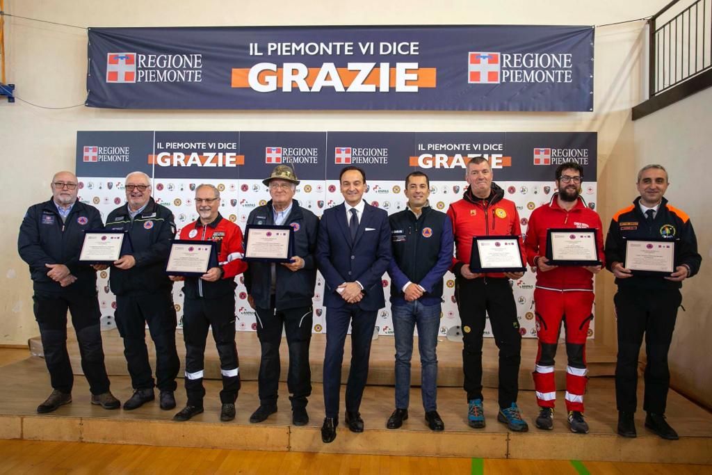 Durante la cerimonia sono state consegnate le targhe di riconoscimento alle competenti regionali e ai loro referenti: Daniele Cora di AIB, Vittorio Ferrero di CRI, Marco Lumello di ANPAS, Marco Lumello di ANC, Luca Gja Arcota del Soccorso Alpino, Giancarlo Bosetti di ANA, Marco Fassero del Coordinamento Regionale Protezione Civile e agli otto coordinamenti territoriali: Andrea Morchio - Coordinamento di Alessandria, Valter Marenco - Coordinamento di Asti, Cleto Canova - Coordinamento di Biella, Roberto Cagna - Coordinamento di Cuneo, Gianfranco Zanetta- Coordinamento di Novara, Leonardo Capuano - Coordinamento di Torino, Francesco Corri Coordinamento di Verbania, Dario Colangelo - Coordinamento di Vercelli.