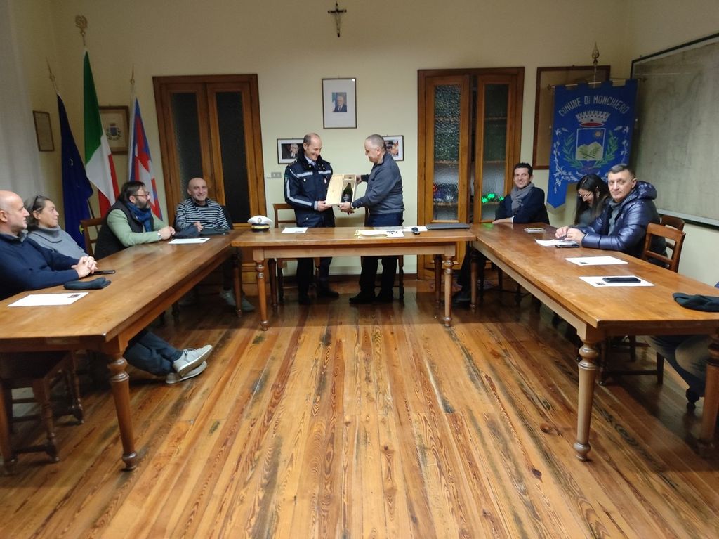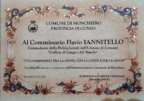 “Un commissario tra la gente, con la gente e per la gente”. Difficile immaginare un complimento migliore di quello che nel pomeriggio di ieri (27 dicembre), in occasione della seduta che ha chiuso l’anno del Consiglio comunale di Monchiero, l’Amministrazione del centro langarolo ha voluto rivolgere pubblicamente all’agente Flavio Iannitello, comandante della Polizia locale dell’Unione dei Comuni “Colline di Langa e del Barolo”, che, dal 31 dicembre, andrà in pensione dopo 39 anni di servizio.