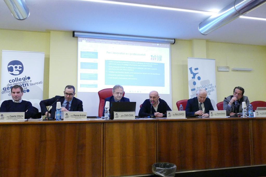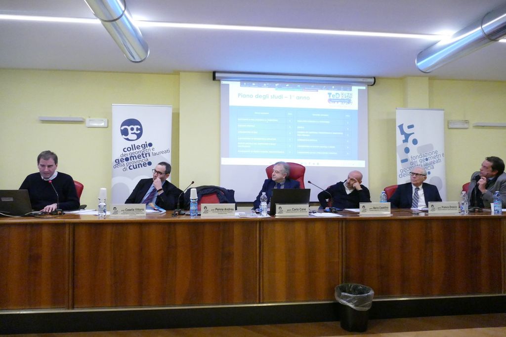 Nutrito il parterre dei relatori, coordinati dai presidenti dei Collegi, Carlo Cane e Marco Castellino. Ad avvicendarsi nel dibattito erano presenti, il professor Andrea Penna, vicerettore Facoltà di Ingegneria dell'Università di Pavia, e il collega Vittorio Casella, referente del Corso di Laurea Professionalizzante in Tecnologie Digitali per le Costruzioni, l’Ambiente e il Territorio, che hanno apportato la loro conoscenza dell’argomento, il consigliere nazionale CNGeGL Livio Spinelli e Franco Drocco, ex presidente del Collegio Geometri di Cuneo.