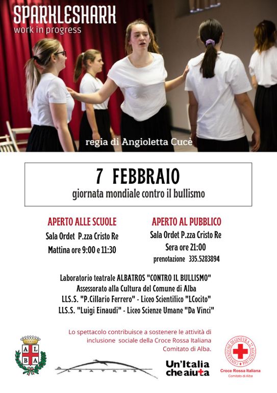 In occasione della "Giornata Mondiale Contro il Bullismo" con il Patrocinio della Città di Alba, sarà riproposto lo spettacolo teatrale "SPARKLESHARK work in progress" .