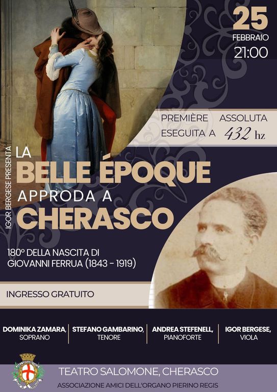 Il 25 febbraio prossimo la città di Cherasco ospiterà un evento dai risvolti particolari, per la propria storia. Nella fattispecie parliamo del concerto “La Belle Époque a Cherasco, Anteprima Première Assoluta a 432hz, 180° della nascita di GIOVANNI FERRUA (1843-1919)
