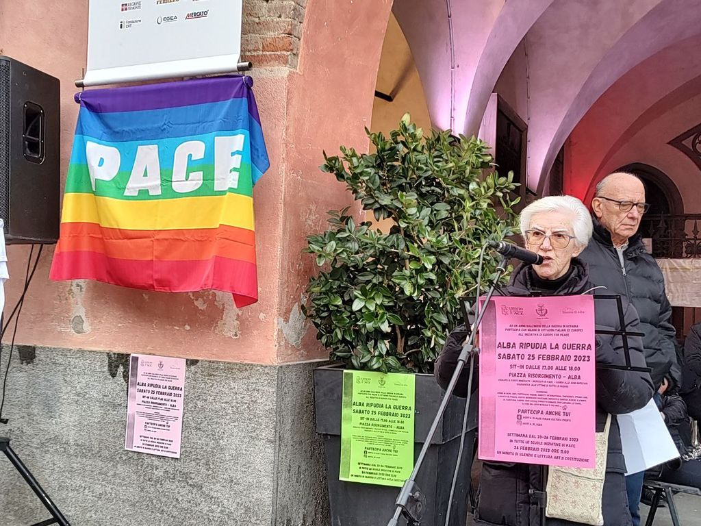 È stato scelto per la manifestazione un titolo concreto e impattante: “Alba ripudia la guerra!”. In merito il Sindaco di Serralunga d’Alba Sergio Moscone ha commentato le implicazioni dell’art.11 della Costituzione italiana, in cui è sancito il rifiuto della guerra “come strumento di offesa alla libertà degli altri popoli e come mezzo di risoluzione delle controversie internazionali”. Ricordando le parole e l’esempio del Presidente Sandro Pertini, del Sindaco di Firenze Giorgio La Pira e del Vangelo secondo Marco, è proseguita la riflessione del primo cittadino del Comune langarolo, che ha affidato alla piazza anche una provocazione: “Come mai i soldi per le armi arrivano subito? Non possiamo ricostruire le strade, ridare case e paesi ai terremotati ma di colpo troviamo soldi per inviare armi. Non otterremo pace fornendo armi alle parti in lotta. La pace inizia a casa nostra”.