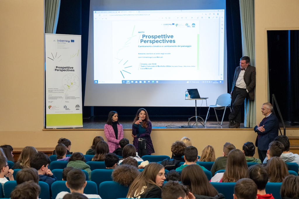 Nell’ambito del percorso di avvicinamento all’inaugurazione delle opere – il 21 e 22 aprile prossimi – Luca Mercalli ha incontrato cinque classi delle scuole superiori di Alba (Apro Formazione, Istituto Professionale per i Servizi Commerciali e Turistici Piera Cillario Ferrero, Scuola Enologica di Alba, Istituto Magistrale Statale "Leonardo da Vinci") e a Monforte d’Alba cinque classi delle scuole medie di Monforte, Barolo e La Morra.