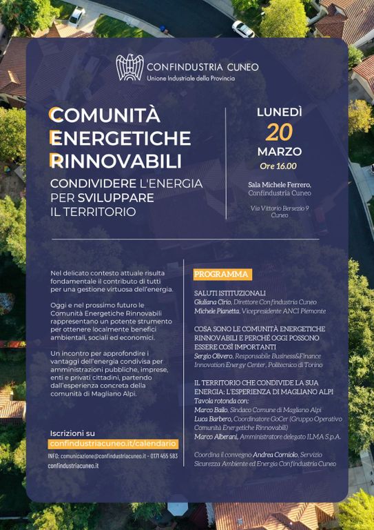 Confindustria Cuneo organizza un incontro per approfondire i vantaggi dell’energia condivisa per amministrazioni pubbliche, imprese, enti e privati cittadini, partendo dall’esperienza concreta della comunità di Magliano Alpi.