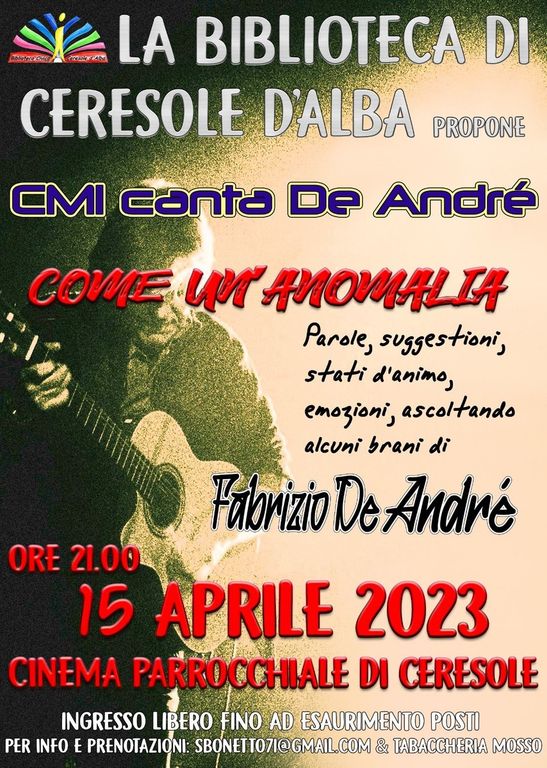 Sabato 15 aprile ore 21 presso il teatro parrocchiale di Ceresole d'Alba si terrà un concerto a cura di CMI dedicato a Fabrizio De Andrè. Il concerto è organizzato dalla Biblioteca civica.