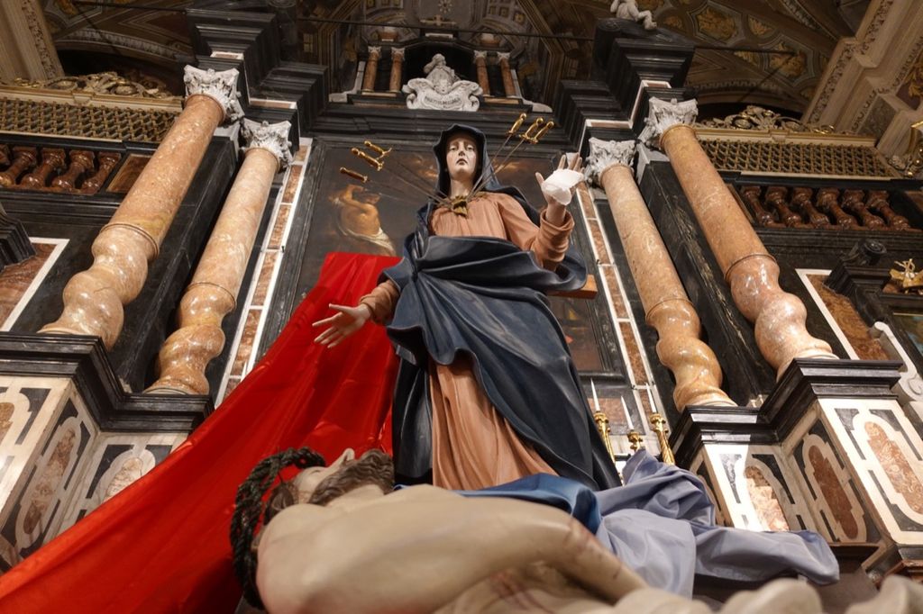Una rappresentazione unitaria, che richiama il dolore di Maria ai piedi della Croce, la sofferenza di quella madre che perde l’unigenito Figlio, fino all’assoluto silenzio della deposizione nel sepolcro. Poi sarà la Pasqua del Cristo Risorto.