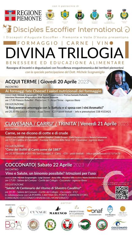 Alla presenza di illustri esperti e consulenti del mondo dell’alimentazione e della cucina nazionale e internazionale l’Associazione Discepoli di Auguste Escoffier - Delegazione Piemonte e Valle d’Aosta propongono una rassegna di incontri (ad ingresso libero) volti a sottolineare la valenza delle proprietà nutritive, della bontà delle tecniche di coltura e allevamento, nonché della qualità e la versatilità delle eccellenze enogastronomiche dei territori piemontesi.