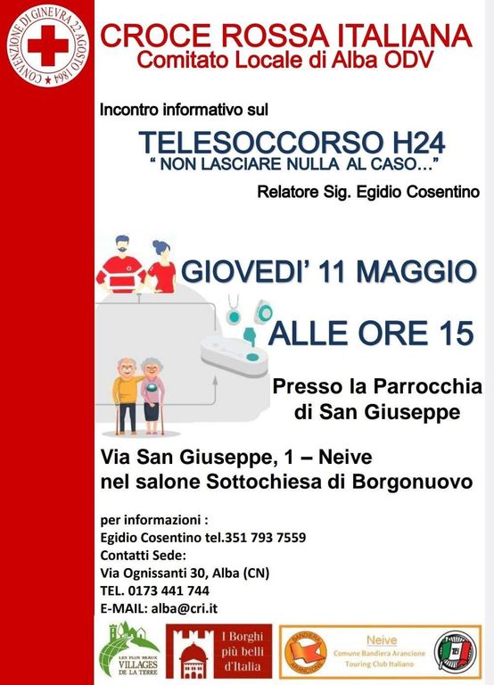Giovedì 11 maggio alle ore 15 presso la parrocchia di San Giuseppe nel salone della chiesa di Borgonuovo è in programma l’incontro per gli anziani dell’Uni3 sulla tematica del telesoccorsoh24 dal titolo “Non lasciare nulla al caso…”, dove il Comitato di Alba della Croce Rossa parlerà di come affrontare le emergenze che si possono presentare nel quotidiano.