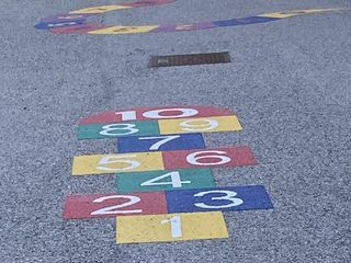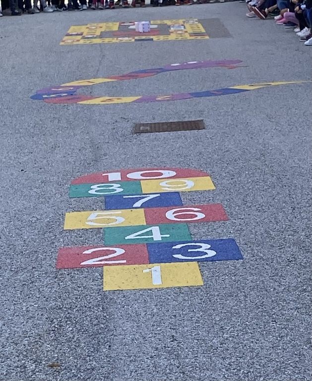 Si tratta di quattro giochi termoplastici, tre dei quali posizionati all’interno del cortile della scuola primaria, lato Via Ghigliano-Via Trieste ed esattamente il gioco dell’oca, della campana e del serpente, ed uno, dei quattro cantoni, nella via chiusa che divide il Palazzetto dello sport dalla scuola materna (foto 3)