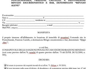 Inoltre, deve essere indicato il possesso dei requisiti richiesti, l'attestazione di aver preso visione del capitolato e l'indirizzo Pec per le comunicazioni, secondo il modello allegato sulla pagina Facebook di ‘Pontechianale’ (che trovate qui al fondo) e al seguente link: