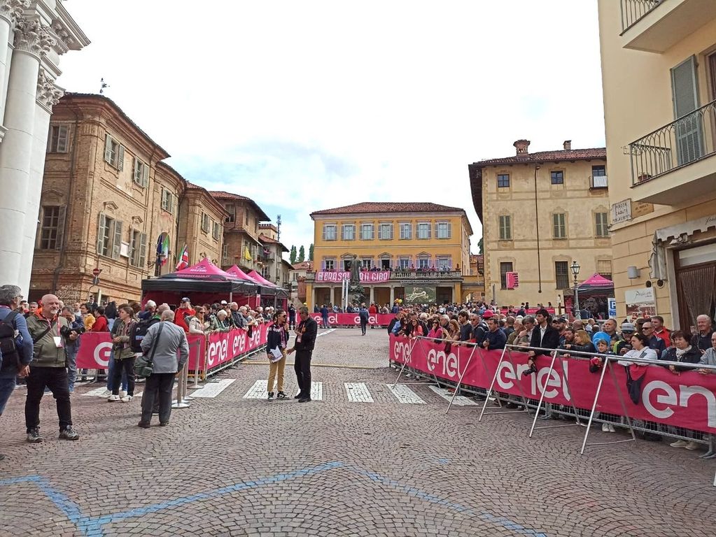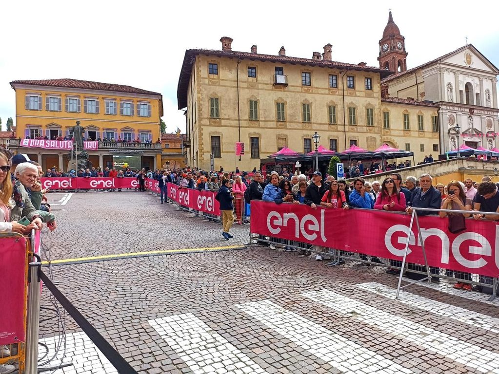 E Giro sia. Tutto pronto a Bra per la partenza della 12ª tappa della corsa rosa edizione 2013, al via alle 12.30 di oggi da una città della Zizzola che, a due ore dalla partenza, si presenta gremita di appassionati, famiglie e tanti bambini, complice anche la chiusura delle scuole decisa dal Comune per dare il proprio benvenuto alla manifestazione, che torna su queste strade a quarto di secolo dal suo ultimo passaggio nella capitale del Roero, la Bra-Borgo San Dalmazzo del 1999.