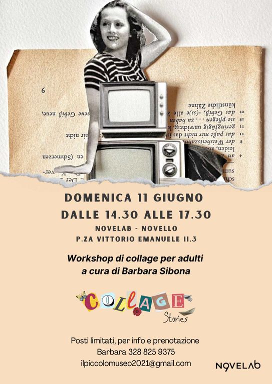 Con l'arrivo di una timida estate il team del Novelab non si ferma e lancia una doppia proposta: domenica 11 giugno al pomeriggio alle 14.30 laboratorio “Collage Stories” con Barbara Sibona. Una proposta per chi vuole trascorre un pomeriggio tra immagini e immaginazione guidati da un'insegnante appassionata e fantasiosa nella creazione di poster artistici. Perfetto per chi desidera un’attività rilassante e creativa,sperimentando il collage, una tecnica artistica poco conosciuta ma davvero per tutti. Per info e iscrizioni: Barbara 328 8259375 ilpiccolomuseo2021@gmail.com