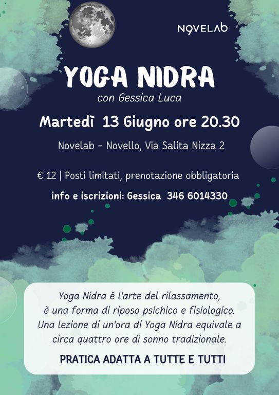 Martedì 13 giugno alle 20.30 Yoga Nidra con Gessica Luca. Yoga Nidra è l'arte del rilassamento, è una forma di riposo psichico, fisiologico e di ringiovanimento più efficace del sonno normale. Una lezione di un'ora di Yoga Nidra equivale a circa quattro ore di sonno tradizionale, perché durante la pratica Nidra si attraversano stati di onde cerebrali che conducono brevemente al rilassamento. Tale pratica è adatta a tutti. Per info e prenotazioni Gessica: 346 6014330 o info@novelab.it