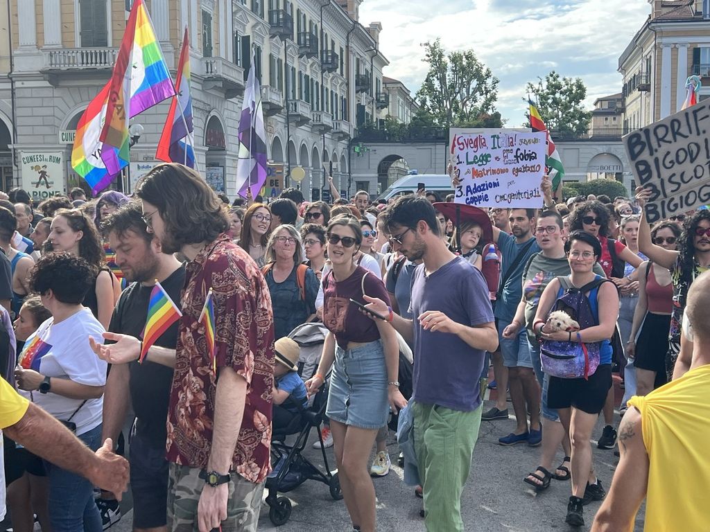 Un corteo di centinaia e centinaia di persone, tra le due e le tre mila, ha sfilato oggi a Cuneo per il secondo Pride nella storia della città, dopo la prima edizione dello scorso anno. Tanti giovani e giovanissimi e tante famiglie in questo evento organizzato nel mese dedicato all’orgoglio LGBTQIA+, alla parità di diritti di genere e all’amore in ogni forma.