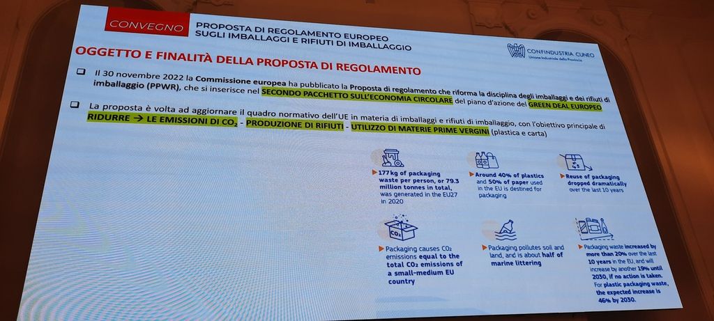 Dopo i saluti istituzionali del presidente di Confindustra Cuneo Mariano Costamagna, Stefano Ramero dell'Ufficio Sicurezza, Ambiente, Energia e Alimenti ha presentato la genesi della proposta di riforma: “Secondo uno studio dell'Unione Europea, ognuno di noi produce ogni anno 177 kg di rifiuti. Circa il 40% della plastica e il 50 % carta sono destinati agli imballaggi che provocano un'emissione di CO2 pari a un piccolo paese europeo. Non solo. La metà dell'inquinamento marittimo è proprio dovuta agli imballaggi che negli ultimi 10 anni hanno subito un incremento del 20%. Ecco che, considerata questa situazione di emergenza, il 30 novembre 2022, viene formulata dall'Europa questa proposta di regolamento che riforma la disciplina degli imballaggi e dei rifiuti ed è inserita all'interno del Green Deal. Parliamo di 65 articoli e 13 allegati spesso ridondanti che vanno a favorire maggiormente il riutilizzo degli imballaggi al posto del riciclo”.