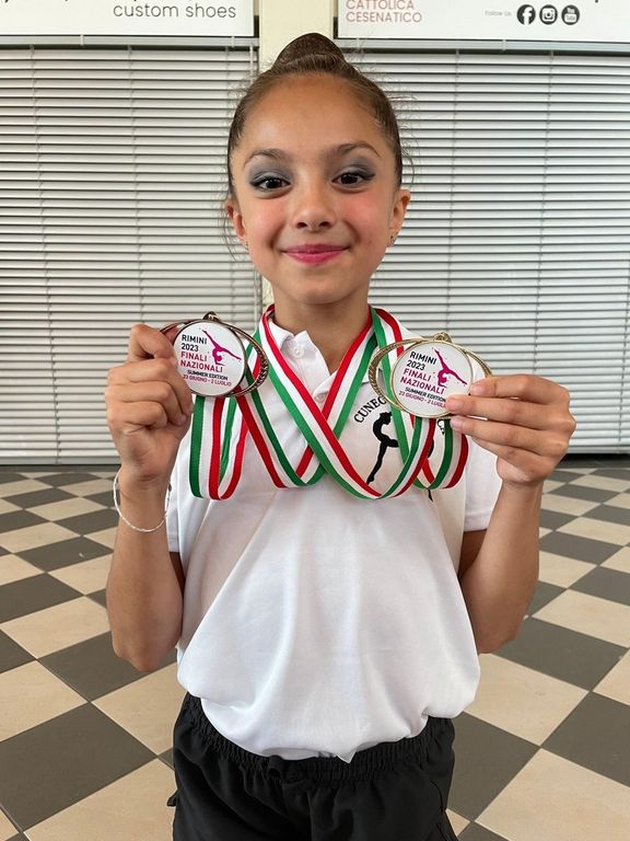 Nel livello LE eccellenza Irene Ciarlo è oro alla palla. Matilde Viano è la Campionessa Italiana al corpo libero nella categoria Allieve 2. Arianna Caliman porta a casa la medaglia di bronzo al cerchio nella fascia Junior 1. Beatrice Mandrile tra le Senior 2 è la migliore all-arounder e anche campionessa italiana di specialità con le clavette. Per lei anche due argenti: al cerchio e alla palla. Francesca Bertaina nella categoria LD Senior 3 è tre volte oro: all-Around, Cerchio e Clavette. Nella stessa categoria Rebecca Capellaro è la campionessa italiana al nastro e bronzo alle clavette. Anna Fraire tra le Senior 2 si contende fino all’ultimo il titolo italiano all-aroud. Chiude purtroppo al secondo posto ma è comunque vice campionessa Italiana. Nelle finali di specialità è la terza miglior ginnasta d’Italia al cerchio e vice campionessa italiana alla palla. Giorgina Plaku, Senior 1, è bronzo italiano all-around, bronzo al cerchio e vice campionessa italiana alla fune. Adele Bramard nella fascia Allieve 2 stupisce la giuria e si aggiudica il titolo Italiano alla fune. Bronzo al corpo libero. Veronica Rossi conquista una meritatissima medaglia di bronzo alle clavette nella categoria delle Junior 1. Anche nel livello LC la A.s.d. Cuneoginnastica è protagonista. Carolina Lovera tra le Senior 2 è la campionessa Italiana alle clavette. Sara Roasio nella fascia Senior 3 vince la competizione con la palla. Sempre tra le Senior 3 Anna Bressano è la vice campionessa italiana al nastro.