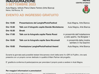 La presentazione ufficiale del LanghePhotoFestival avrà luogo domenica 3 settembre 2023 alle ore 15:00 presso l’Aula Magna dell’Istituto Piera Cillario Ferrero di Neive, in Via Rocca 10. Il pomeriggio continuerà con le diverse Talk dei tre fotografi ospiti presenti in loco e la presentazione delle loro mostre e installazioni fotografiche.