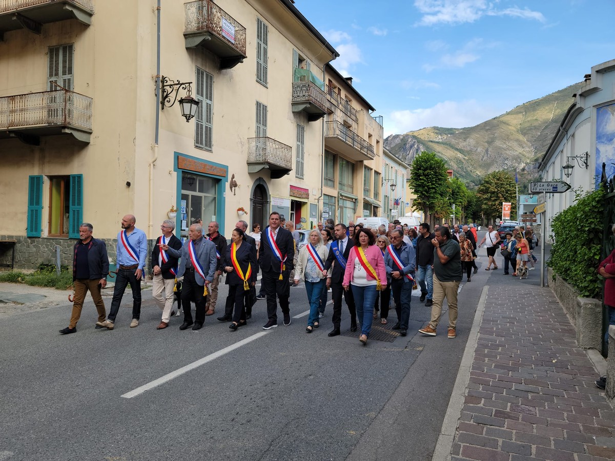 Erano meno di un centinaio le persone che stamattina (sabato 16 settembre) alle 10 si sono ritrovate sul piazzale antistante la stazione ferroviaria di Tenda per partecipare alla manifestazione organizzata dai primi cittadini della Val Roya, sindaco Jean Pierre Vassallo in testa. Il corteo si è snodato per la strada principale, fino al municipio.