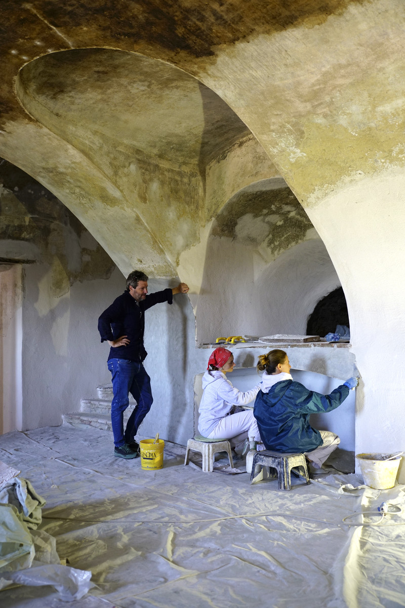 [Alfio Cavallotto con le restauratrici impegnate nelle cucine medioevali del castello]
