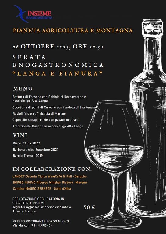 Il Pianeta Agricoltura e Montagna dell’Associazione Insieme invita soci e simpatizzanti alla serata enogastronomica che si terrà giovedì 26 ottobre a Marene, presso il ristorante “Borgo Nuovo” Albergo Winebar Ristoro, in collaborazione con “Langhet” – Osteria Tipica Winecafé & Poll di Bergolo e la Cantina Mauro Sebaste di Gallo d’Alba. La proposta di menù “Langa e Pianura” valorizza i prodotti di due territori molto diversi (Alta langa e Pianura), due realtà gastronomiche diverse che vedono impegnati cuochi di eccellenza.